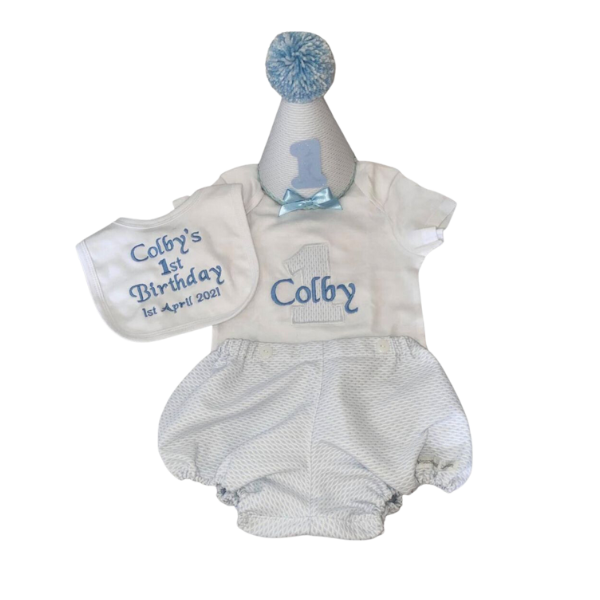 Our stunning handmade birthday boy set is handmade using quality fabrics finished off with beautiful little buttons and satin bows. Bodysuits are expertly embroidered to personalise with name and number of your choice.