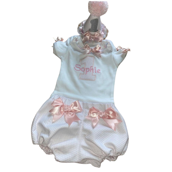 Our stunning handmade birthday girl set is handmade using quality fabrics finished off with beautiful frills and satin bows. Bodysuits are expertly embroidered to personalise with name and number of your choice.