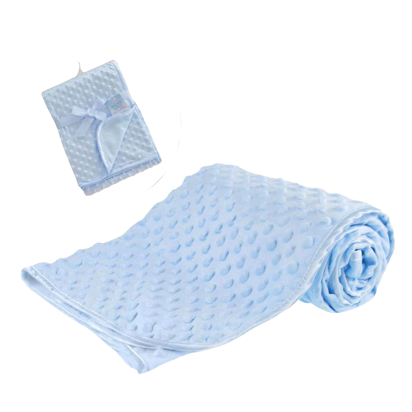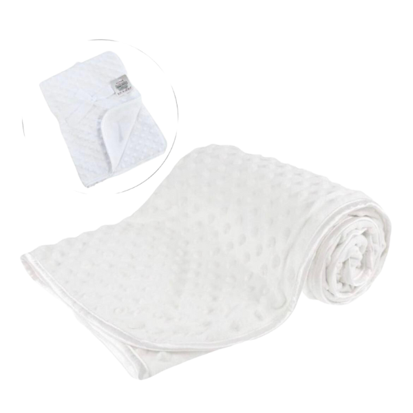 Luxurious soft dimple blanket with elegant satin trim, finished off with a fleece backing for maximum comfort. Personalised baby blanket with embroidered name, making it a perfect keepsake.