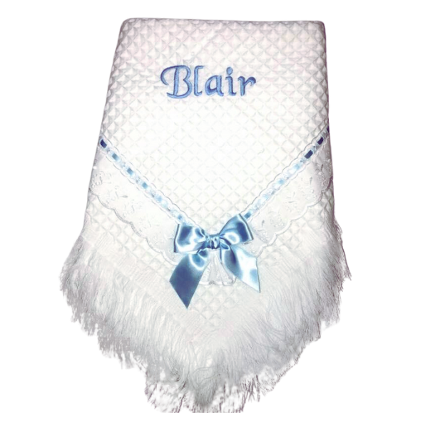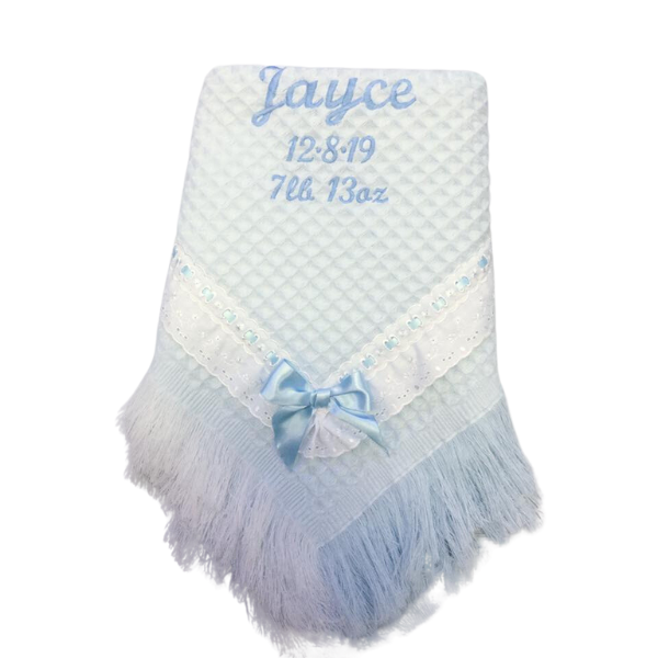 Unique design by Moongemz Baby! Luxury personalised baby shawl blanket with a beautiful waffle weave. Customised with broderie anglaise lace & ribbon slot with contrasting ribbon, and then finished off with a pretty satin bow. This high quality shawl is guaranteed to not only be the perfect sleeping partner for your little one but is also an excellent keepsake with our expertly embroidered personalisation.